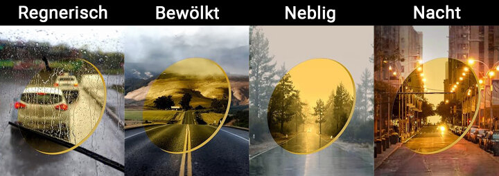 Vielseitig für alle Bedingungen: PolorVision Die Brille ist perfekt für alle Arten von Nachtfahrten – von Straßen in der Stadt bis zu Landstraßen. Egal, ob es regnet, neblig ist oder dunstig, diese Brille sorgt für eine klare, scharfe Sicht, damit Sie unter den unterschiedlichsten Bedingungen sicher sind.